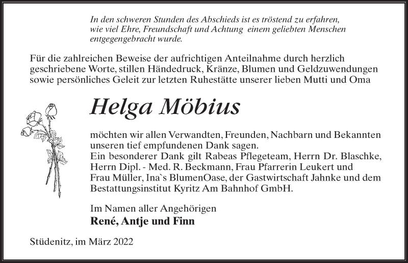 Hier finden Sie alle Traueranzeigen aus der Zeitung, die bisher für Helga Möbius erschienen sind. Weitere Traueranzeigen, die in der Zeitung erscheinen, werden hier ebenfalls aufgelistet