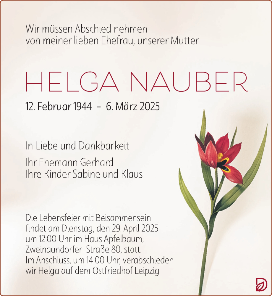 Hier finden Sie alle Traueranzeigen aus der Zeitung, die bisher für Helga Nauber erschienen sind. Weitere Traueranzeigen, die in der Zeitung erscheinen, werden hier ebenfalls aufgelistet