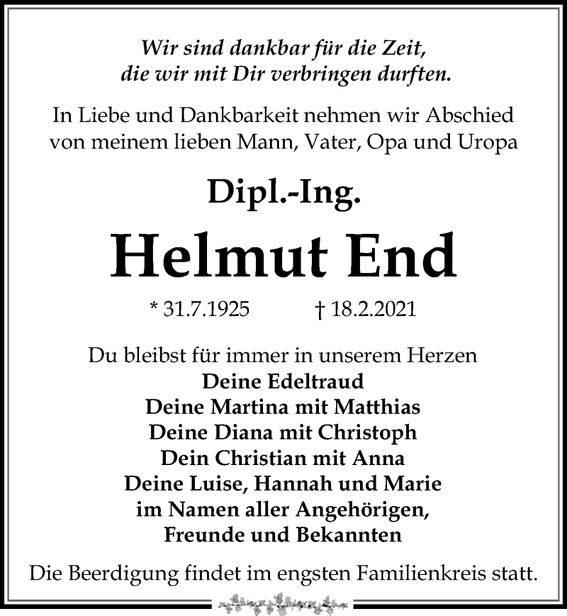 Hier finden Sie alle Traueranzeigen aus der Zeitung, die bisher für Helmut End erschienen sind. Weitere Traueranzeigen, die in der Zeitung erscheinen, werden hier ebenfalls aufgelistet