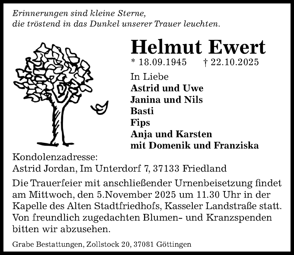 Hier finden Sie alle Traueranzeigen aus der Zeitung, die bisher für Helmut Ewert erschienen sind. Weitere Traueranzeigen, die in der Zeitung erscheinen, werden hier ebenfalls aufgelistet