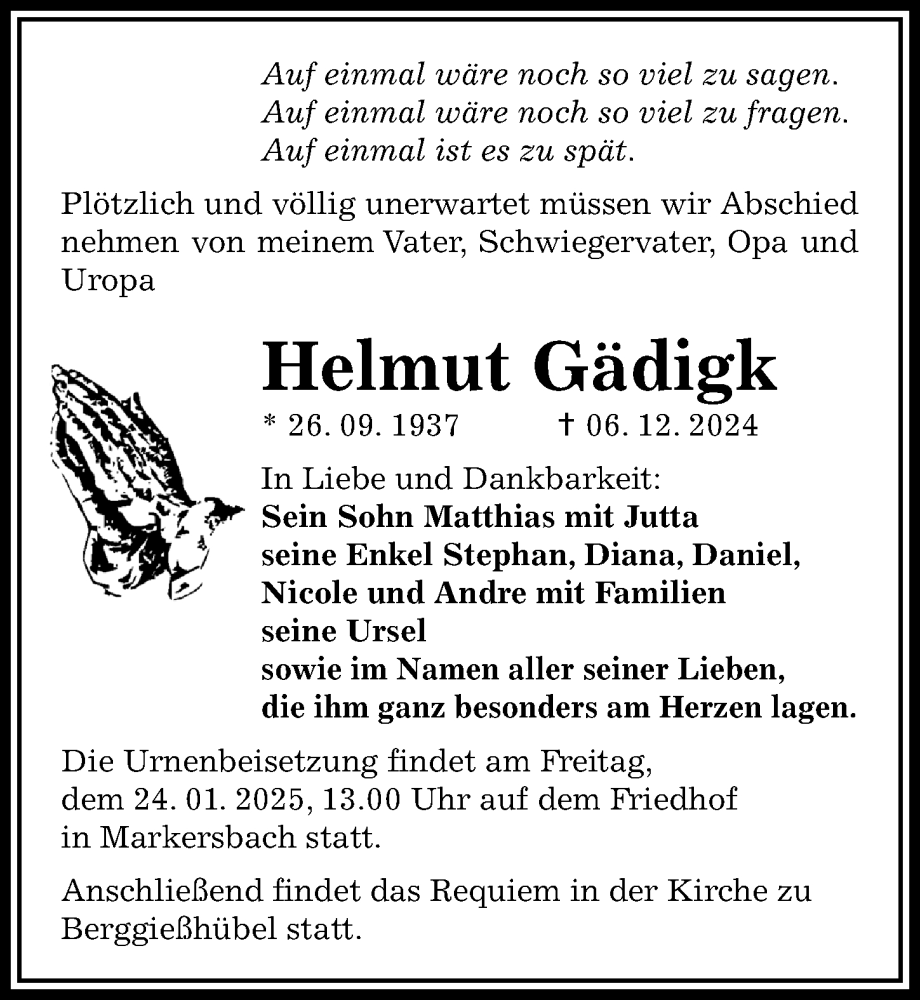 Hier finden Sie alle Traueranzeigen aus der Zeitung, die bisher für Helmut Gädigk erschienen sind. Weitere Traueranzeigen, die in der Zeitung erscheinen, werden hier ebenfalls aufgelistet