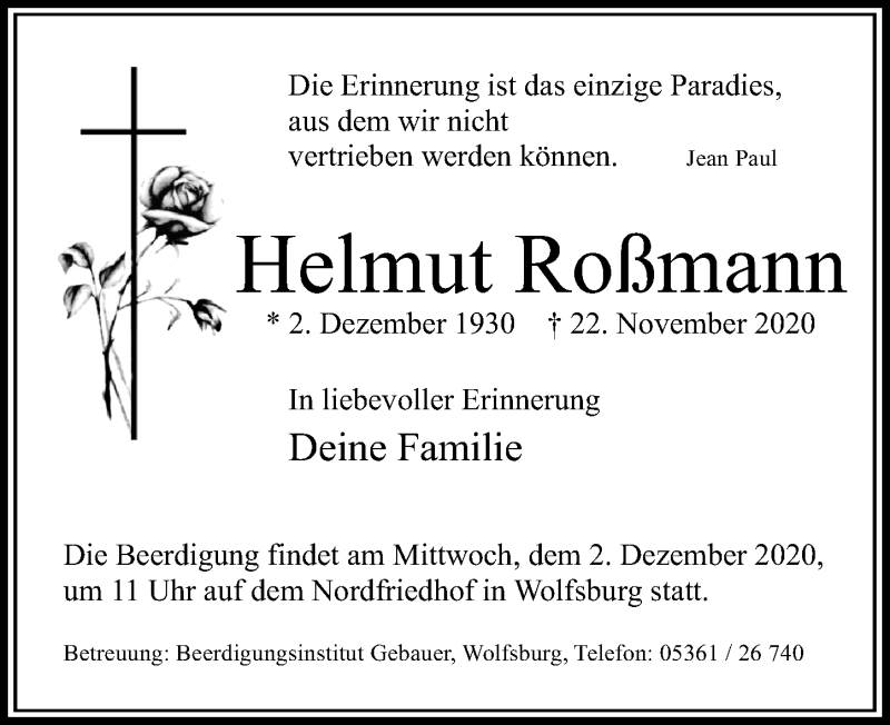Hier finden Sie alle Traueranzeigen aus der Zeitung, die bisher für Helmut Roßmann erschienen sind. Weitere Traueranzeigen, die in der Zeitung erscheinen, werden hier ebenfalls aufgelistet