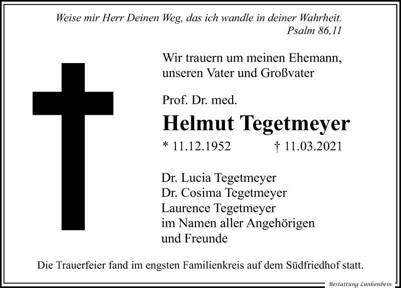 Hier finden Sie alle Traueranzeigen aus der Zeitung, die bisher für Helmut Tegetmeyer erschienen sind. Weitere Traueranzeigen, die in der Zeitung erscheinen, werden hier ebenfalls aufgelistet