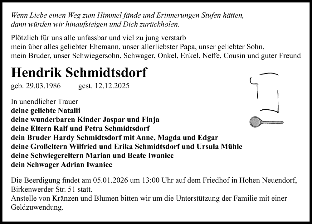 Hier finden Sie alle Traueranzeigen aus der Zeitung, die bisher für Hendrik Schmidtsdorf erschienen sind. Weitere Traueranzeigen, die in der Zeitung erscheinen, werden hier ebenfalls aufgelistet