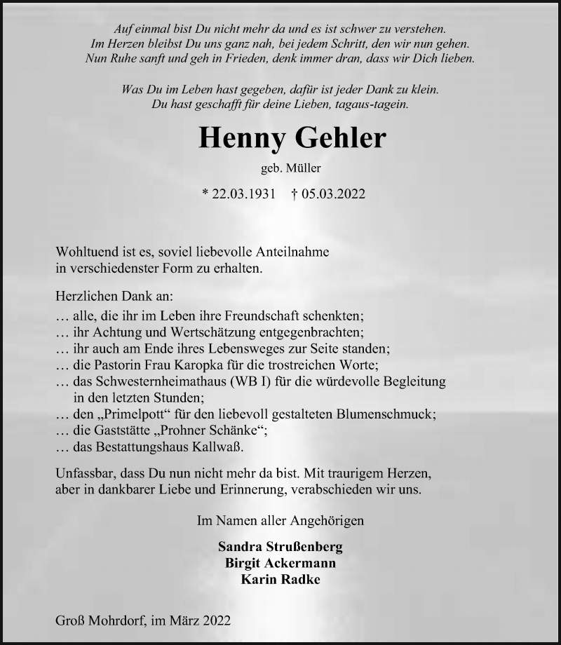 Hier finden Sie alle Traueranzeigen aus der Zeitung, die bisher für Henny Gehler erschienen sind. Weitere Traueranzeigen, die in der Zeitung erscheinen, werden hier ebenfalls aufgelistet