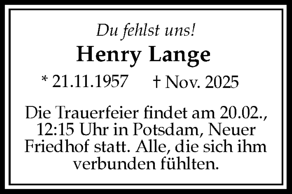 Hier finden Sie alle Traueranzeigen aus der Zeitung, die bisher für Henry Lange erschienen sind. Weitere Traueranzeigen, die in der Zeitung erscheinen, werden hier ebenfalls aufgelistet