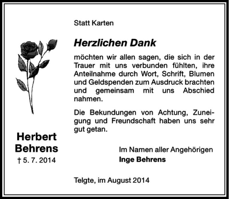 Hier finden Sie alle Traueranzeigen aus der Zeitung, die bisher für Herbert Behrens erschienen sind. Weitere Traueranzeigen, die in der Zeitung erscheinen, werden hier ebenfalls aufgelistet