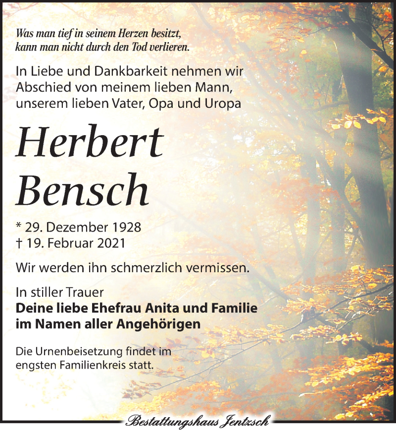 Hier finden Sie alle Traueranzeigen aus der Zeitung, die bisher für Herbert Bensch erschienen sind. Weitere Traueranzeigen, die in der Zeitung erscheinen, werden hier ebenfalls aufgelistet