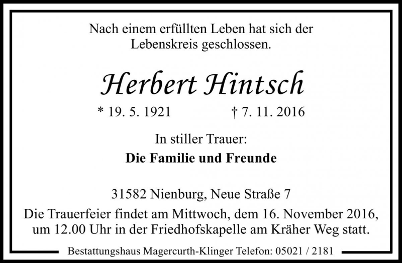 Hier finden Sie alle Traueranzeigen aus der Zeitung, die bisher für Herbert Hintsch erschienen sind. Weitere Traueranzeigen, die in der Zeitung erscheinen, werden hier ebenfalls aufgelistet