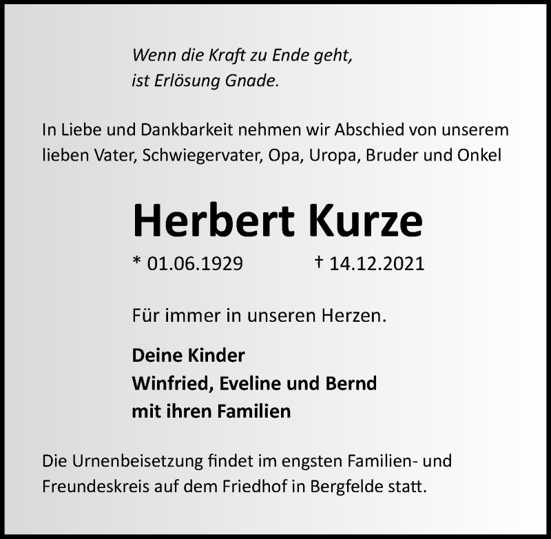 Hier finden Sie alle Traueranzeigen aus der Zeitung, die bisher für Herbert Kurze erschienen sind. Weitere Traueranzeigen, die in der Zeitung erscheinen, werden hier ebenfalls aufgelistet