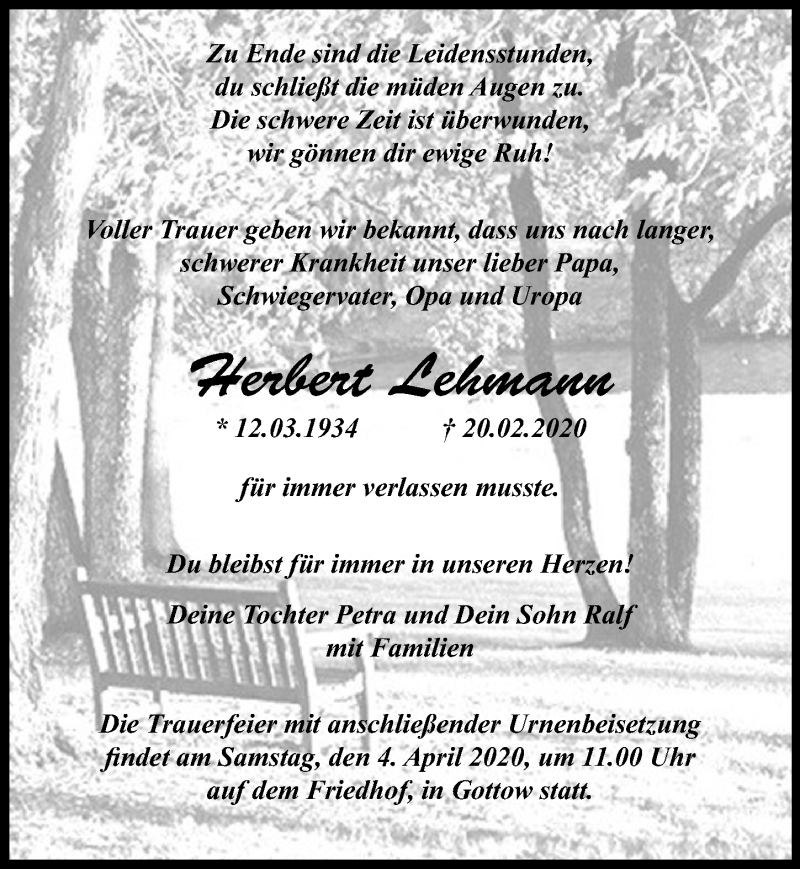 Hier finden Sie alle Traueranzeigen aus der Zeitung, die bisher für Herbert Lehmann erschienen sind. Weitere Traueranzeigen, die in der Zeitung erscheinen, werden hier ebenfalls aufgelistet
