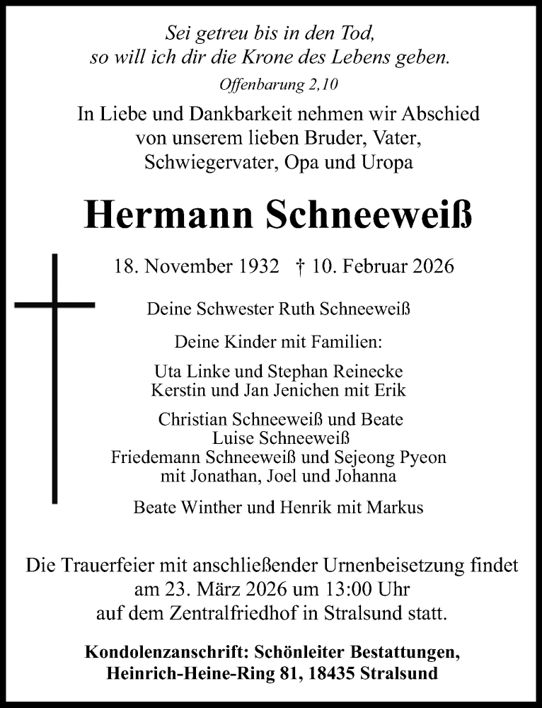 Hier finden Sie alle Traueranzeigen aus der Zeitung, die bisher für Hermann Schneeweiß erschienen sind. Weitere Traueranzeigen, die in der Zeitung erscheinen, werden hier ebenfalls aufgelistet