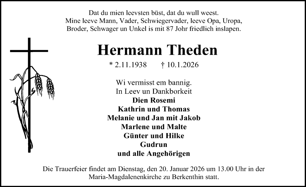 Hier finden Sie alle Traueranzeigen aus der Zeitung, die bisher für Hermann Theden erschienen sind. Weitere Traueranzeigen, die in der Zeitung erscheinen, werden hier ebenfalls aufgelistet