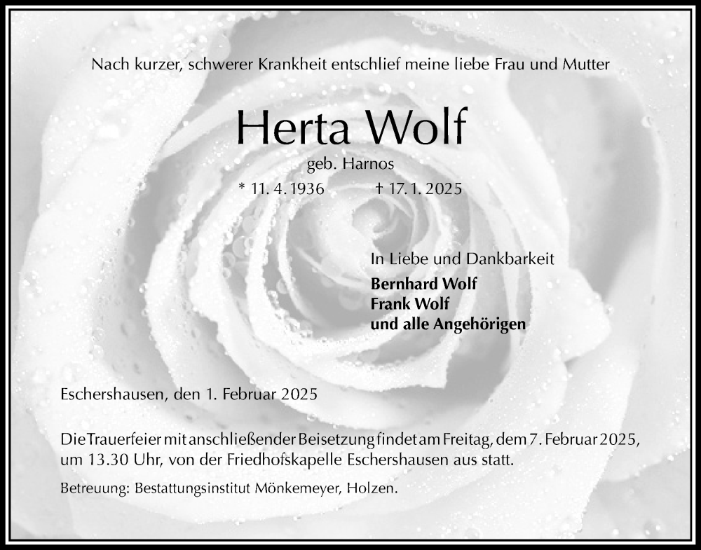 Hier finden Sie alle Traueranzeigen aus der Zeitung, die bisher für Herta Wolf erschienen sind. Weitere Traueranzeigen, die in der Zeitung erscheinen, werden hier ebenfalls aufgelistet