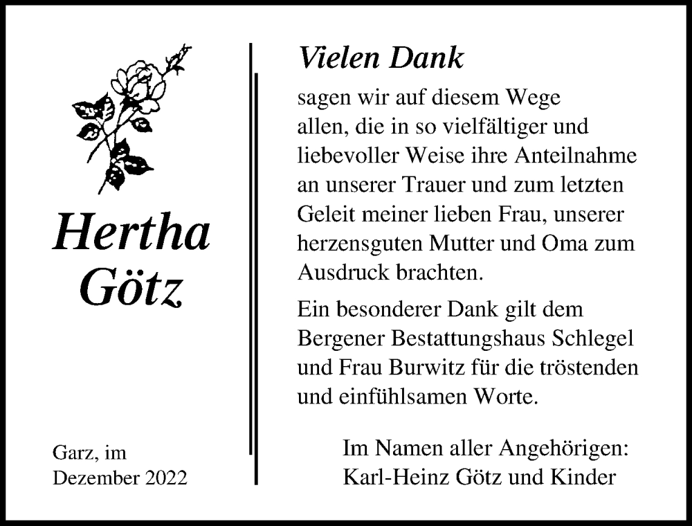 Hier finden Sie alle Traueranzeigen aus der Zeitung, die bisher für Hertha Götz erschienen sind. Weitere Traueranzeigen, die in der Zeitung erscheinen, werden hier ebenfalls aufgelistet