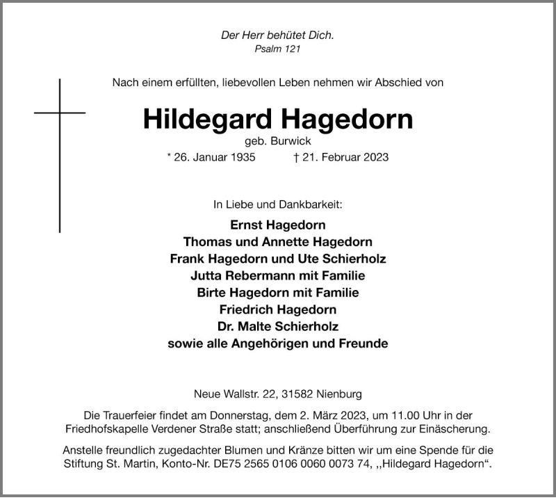 Hier finden Sie alle Traueranzeigen aus der Zeitung, die bisher für Hildegard Hagedorn erschienen sind. Weitere Traueranzeigen, die in der Zeitung erscheinen, werden hier ebenfalls aufgelistet