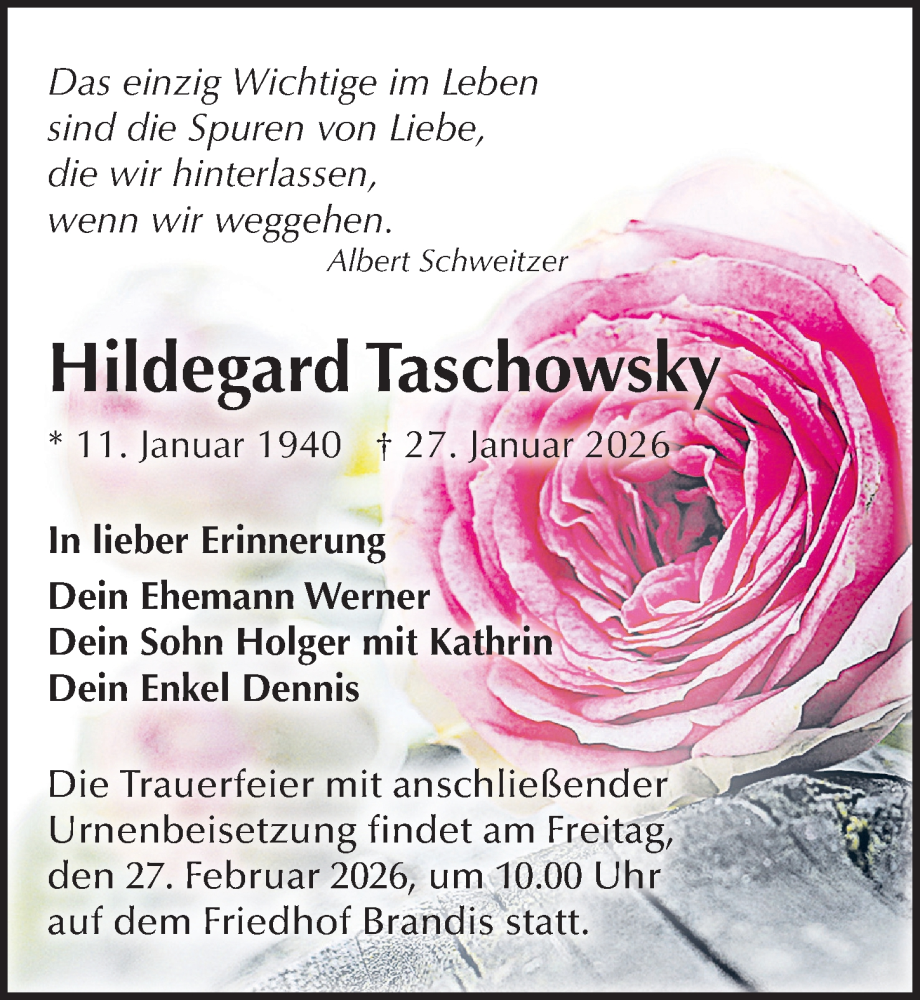 Hier finden Sie alle Traueranzeigen aus der Zeitung, die bisher für Hildegard Taschowsky erschienen sind. Weitere Traueranzeigen, die in der Zeitung erscheinen, werden hier ebenfalls aufgelistet