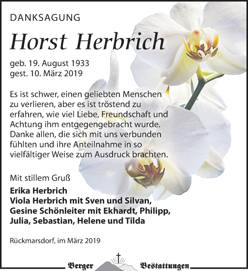 Hier finden Sie alle Traueranzeigen aus der Zeitung, die bisher für Horst Herbrich erschienen sind. Weitere Traueranzeigen, die in der Zeitung erscheinen, werden hier ebenfalls aufgelistet