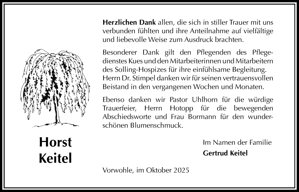 Hier finden Sie alle Traueranzeigen aus der Zeitung, die bisher für Horst Keitel erschienen sind. Weitere Traueranzeigen, die in der Zeitung erscheinen, werden hier ebenfalls aufgelistet