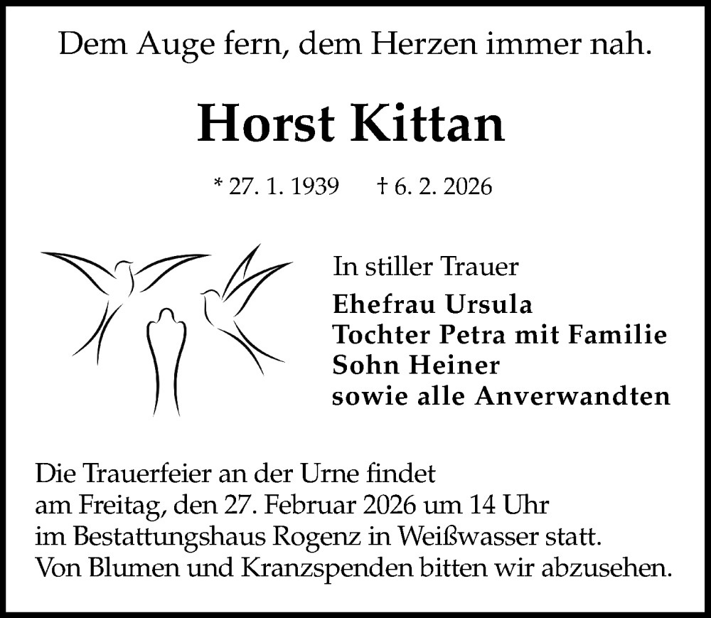 Hier finden Sie alle Traueranzeigen aus der Zeitung, die bisher für Horst Kittan erschienen sind. Weitere Traueranzeigen, die in der Zeitung erscheinen, werden hier ebenfalls aufgelistet