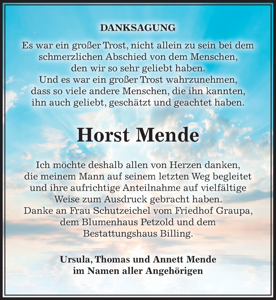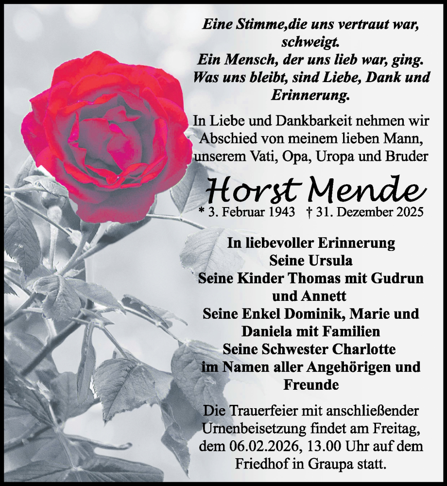 Hier finden Sie alle Traueranzeigen aus der Zeitung, die bisher für Horst Mende erschienen sind. Weitere Traueranzeigen, die in der Zeitung erscheinen, werden hier ebenfalls aufgelistet
