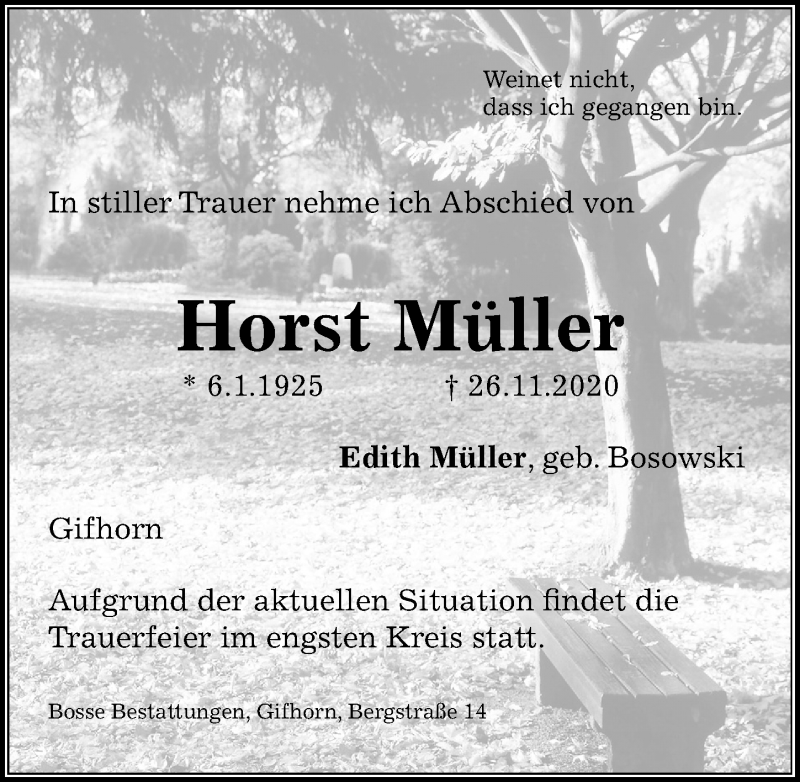 Hier finden Sie alle Traueranzeigen aus der Zeitung, die bisher für Horst Müller erschienen sind. Weitere Traueranzeigen, die in der Zeitung erscheinen, werden hier ebenfalls aufgelistet
