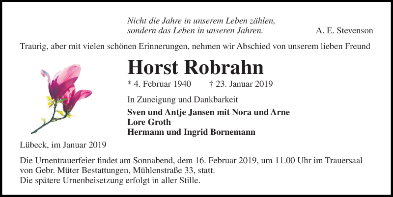 Hier finden Sie alle Traueranzeigen aus der Zeitung, die bisher für Horst Robrahn erschienen sind. Weitere Traueranzeigen, die in der Zeitung erscheinen, werden hier ebenfalls aufgelistet