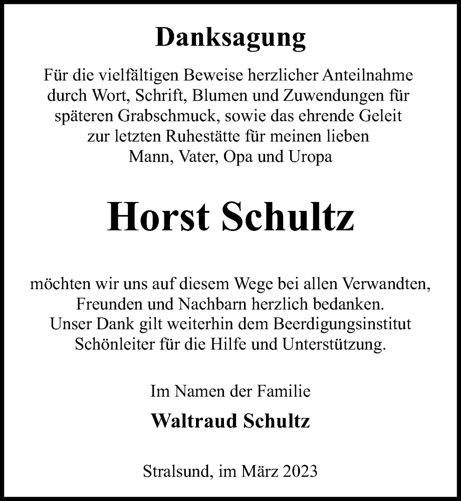 Hier finden Sie alle Traueranzeigen aus der Zeitung, die bisher für Horst Schultz erschienen sind. Weitere Traueranzeigen, die in der Zeitung erscheinen, werden hier ebenfalls aufgelistet