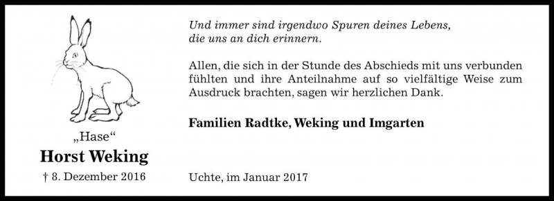 Hier finden Sie alle Traueranzeigen aus der Zeitung, die bisher für Horst Weking erschienen sind. Weitere Traueranzeigen, die in der Zeitung erscheinen, werden hier ebenfalls aufgelistet