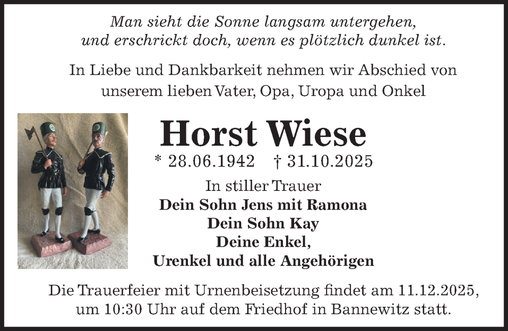 Hier finden Sie alle Traueranzeigen aus der Zeitung, die bisher für Horst Wiese erschienen sind. Weitere Traueranzeigen, die in der Zeitung erscheinen, werden hier ebenfalls aufgelistet
