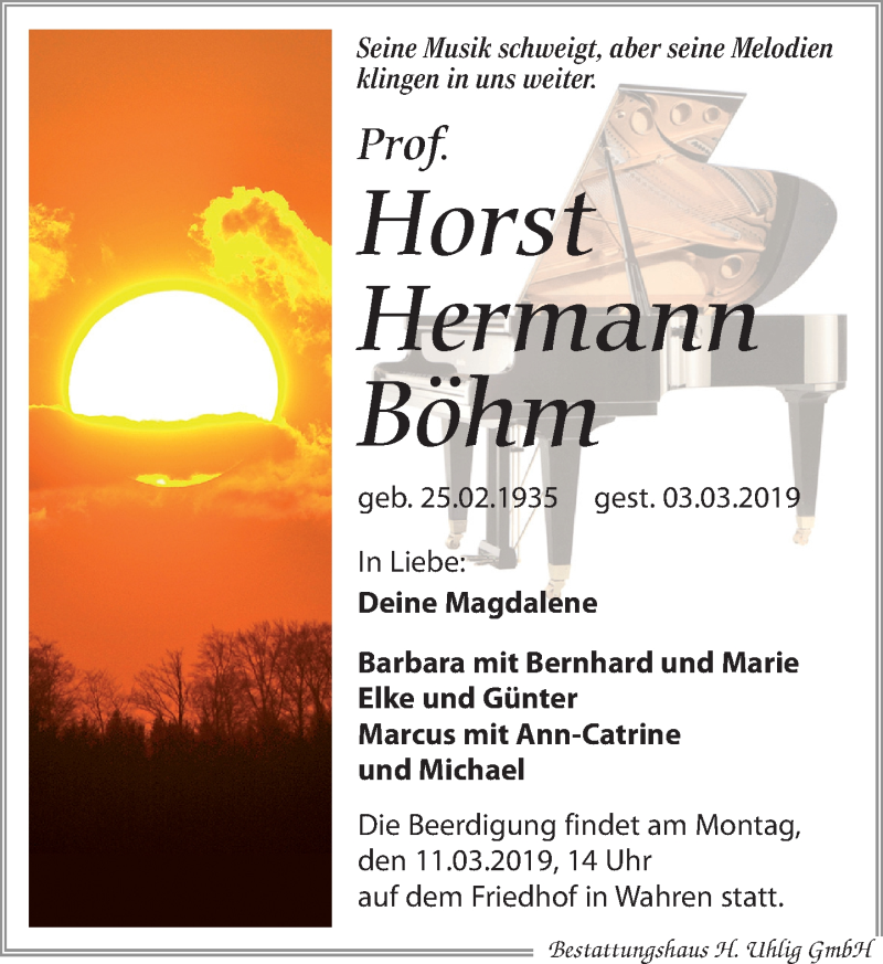 Hier finden Sie alle Traueranzeigen aus der Zeitung, die bisher für Horst Hermann Böhm erschienen sind. Weitere Traueranzeigen, die in der Zeitung erscheinen, werden hier ebenfalls aufgelistet