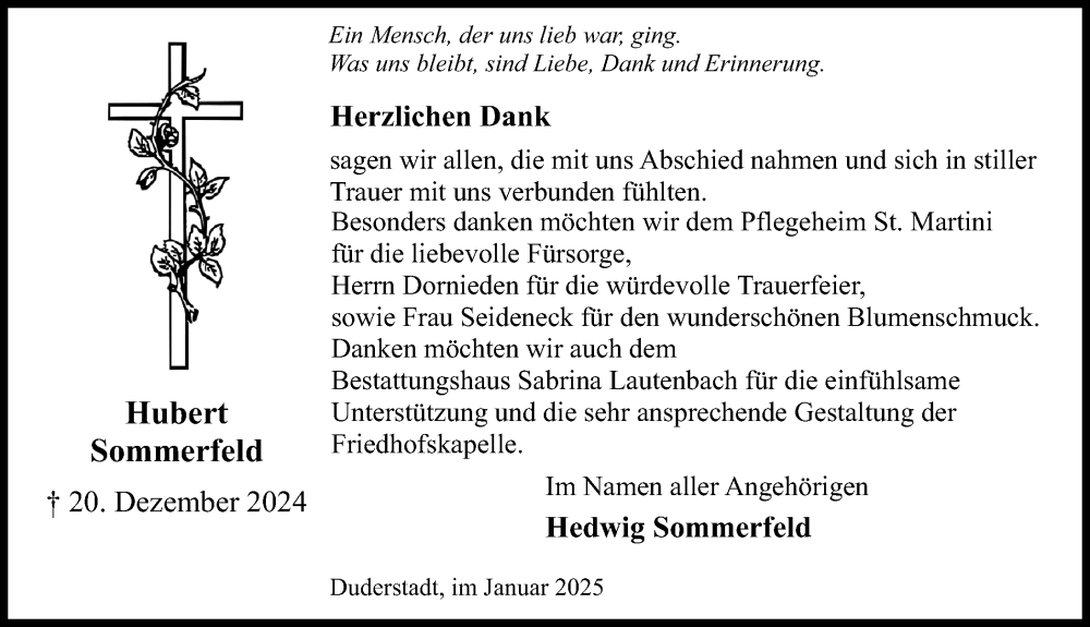 Hier finden Sie alle Traueranzeigen aus der Zeitung, die bisher für Hubert Sommerfeld erschienen sind. Weitere Traueranzeigen, die in der Zeitung erscheinen, werden hier ebenfalls aufgelistet