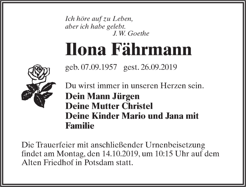 Hier finden Sie alle Traueranzeigen aus der Zeitung, die bisher für Ilona Fährmann erschienen sind. Weitere Traueranzeigen, die in der Zeitung erscheinen, werden hier ebenfalls aufgelistet