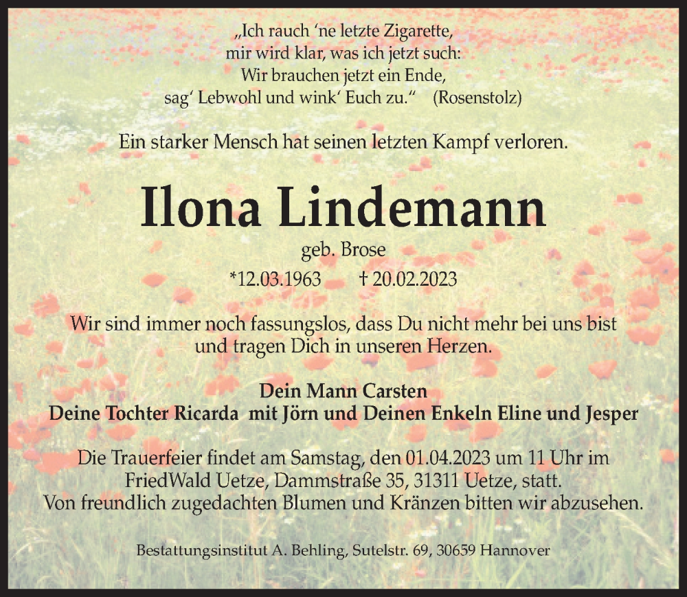 Hier finden Sie alle Traueranzeigen aus der Zeitung, die bisher für Ilona Lindemann erschienen sind. Weitere Traueranzeigen, die in der Zeitung erscheinen, werden hier ebenfalls aufgelistet