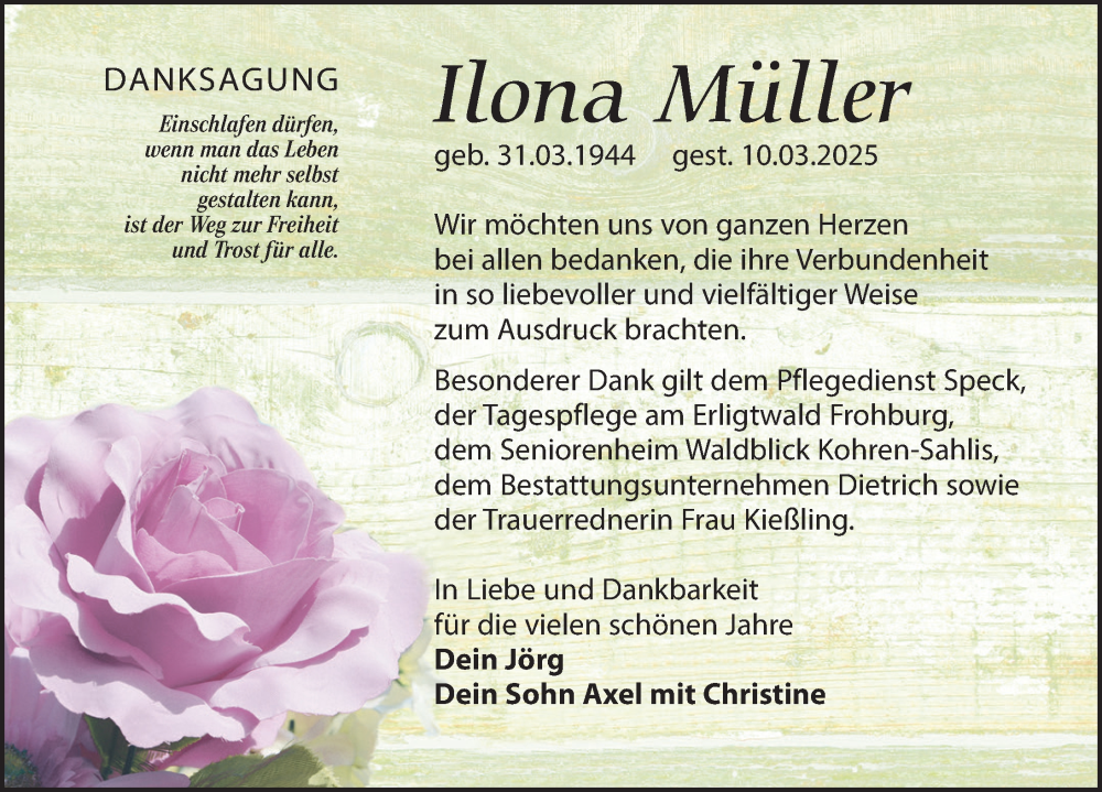 Hier finden Sie alle Traueranzeigen aus der Zeitung, die bisher für Ilona Müller erschienen sind. Weitere Traueranzeigen, die in der Zeitung erscheinen, werden hier ebenfalls aufgelistet