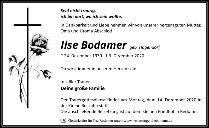 Hier finden Sie alle Traueranzeigen aus der Zeitung, die bisher für Ilse Bodamer erschienen sind. Weitere Traueranzeigen, die in der Zeitung erscheinen, werden hier ebenfalls aufgelistet