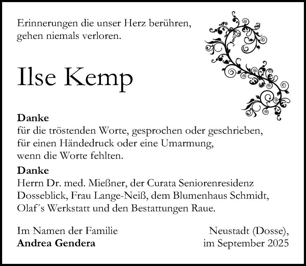 Hier finden Sie alle Traueranzeigen aus der Zeitung, die bisher für Ilse Kemp erschienen sind. Weitere Traueranzeigen, die in der Zeitung erscheinen, werden hier ebenfalls aufgelistet