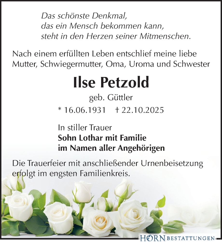 Hier finden Sie alle Traueranzeigen aus der Zeitung, die bisher für Ilse Petzold erschienen sind. Weitere Traueranzeigen, die in der Zeitung erscheinen, werden hier ebenfalls aufgelistet