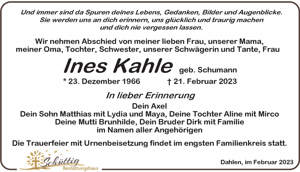 Hier finden Sie alle Traueranzeigen aus der Zeitung, die bisher für Ines Kahle erschienen sind. Weitere Traueranzeigen, die in der Zeitung erscheinen, werden hier ebenfalls aufgelistet