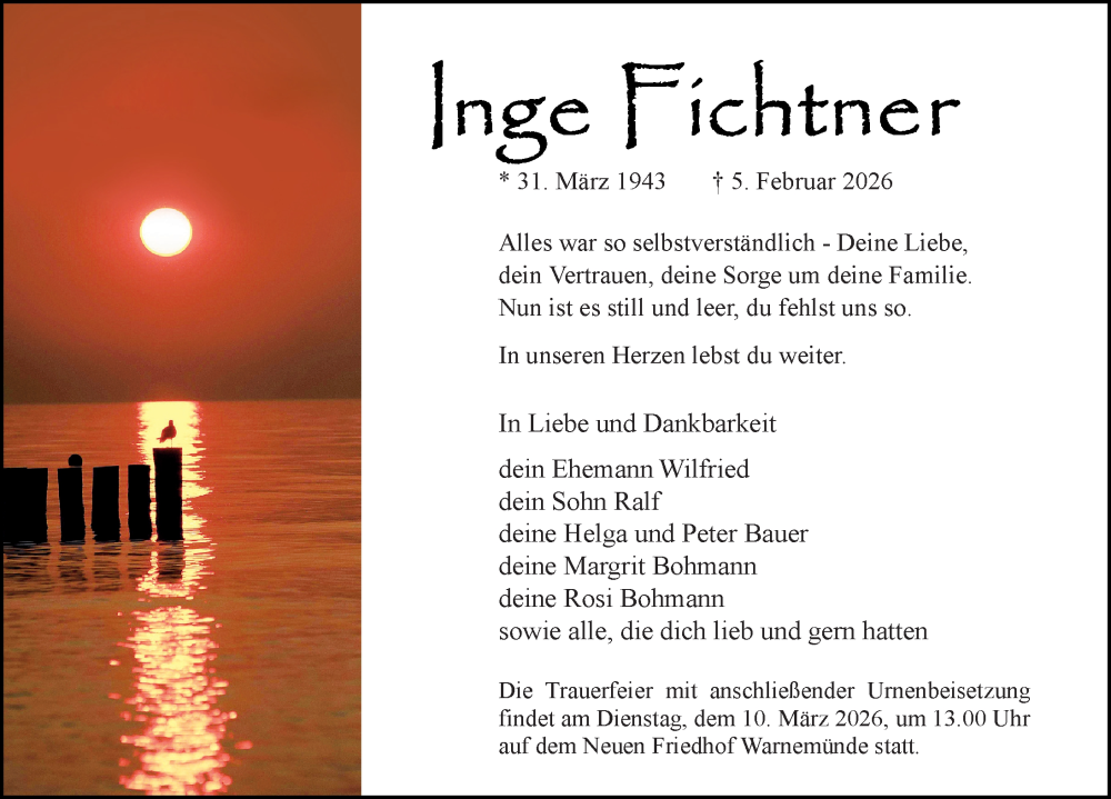 Hier finden Sie alle Traueranzeigen aus der Zeitung, die bisher für Inge Fichtner erschienen sind. Weitere Traueranzeigen, die in der Zeitung erscheinen, werden hier ebenfalls aufgelistet
