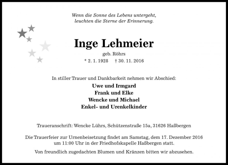 Hier finden Sie alle Traueranzeigen aus der Zeitung, die bisher für Inge Lehmeier erschienen sind. Weitere Traueranzeigen, die in der Zeitung erscheinen, werden hier ebenfalls aufgelistet