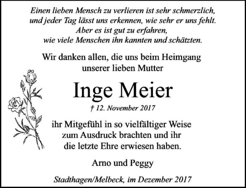 Hier finden Sie alle Traueranzeigen aus der Zeitung, die bisher für Inge Meier erschienen sind. Weitere Traueranzeigen, die in der Zeitung erscheinen, werden hier ebenfalls aufgelistet