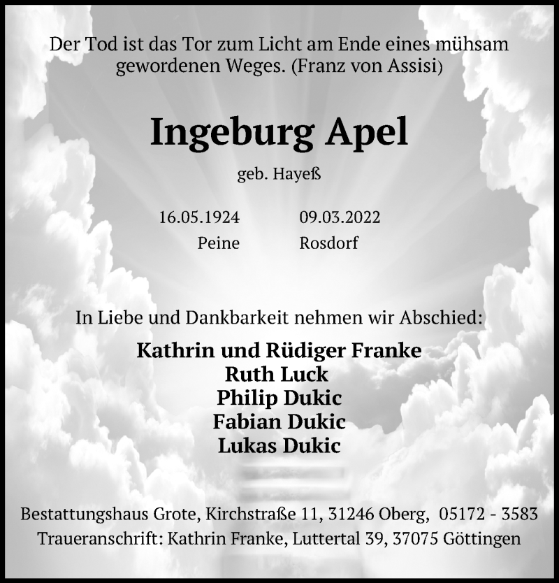 Hier finden Sie alle Traueranzeigen aus der Zeitung, die bisher für Ingeburg Apel erschienen sind. Weitere Traueranzeigen, die in der Zeitung erscheinen, werden hier ebenfalls aufgelistet