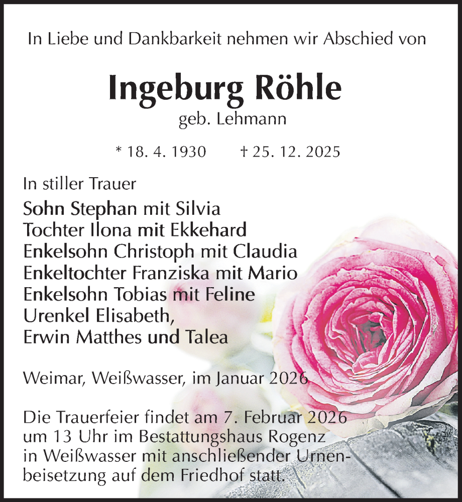 Hier finden Sie alle Traueranzeigen aus der Zeitung, die bisher für Ingeburg Röhle erschienen sind. Weitere Traueranzeigen, die in der Zeitung erscheinen, werden hier ebenfalls aufgelistet