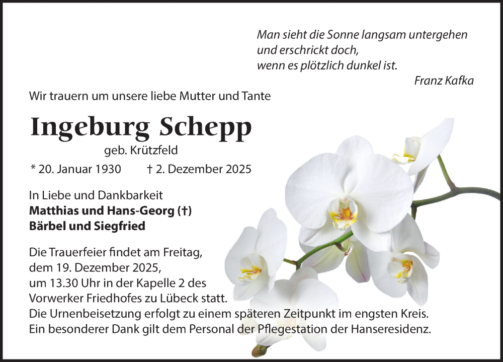 Hier finden Sie alle Traueranzeigen aus der Zeitung, die bisher für Ingeburg Schepp erschienen sind. Weitere Traueranzeigen, die in der Zeitung erscheinen, werden hier ebenfalls aufgelistet