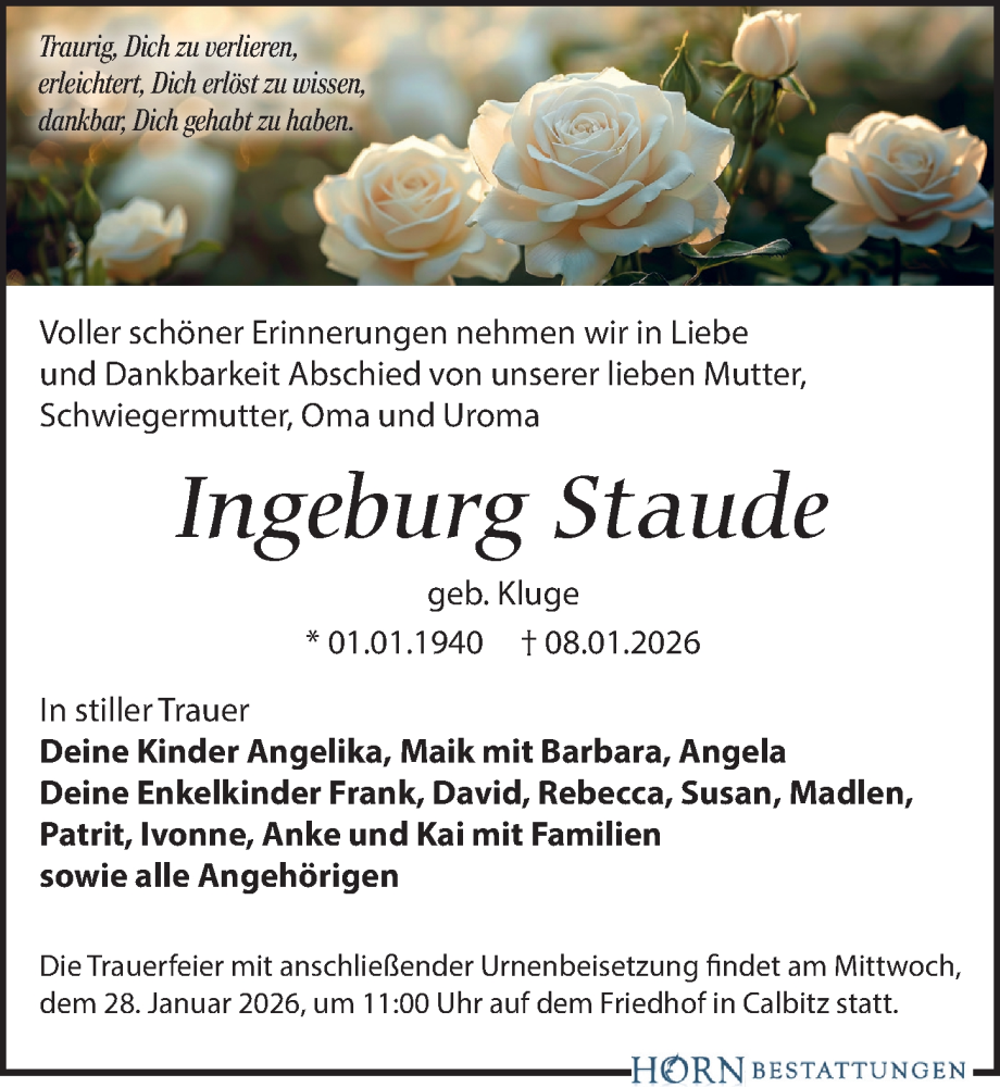 Hier finden Sie alle Traueranzeigen aus der Zeitung, die bisher für Ingeburg Staude erschienen sind. Weitere Traueranzeigen, die in der Zeitung erscheinen, werden hier ebenfalls aufgelistet