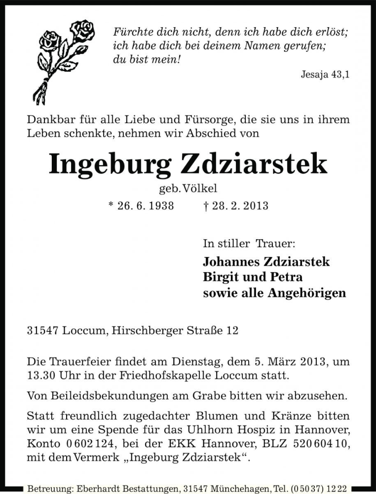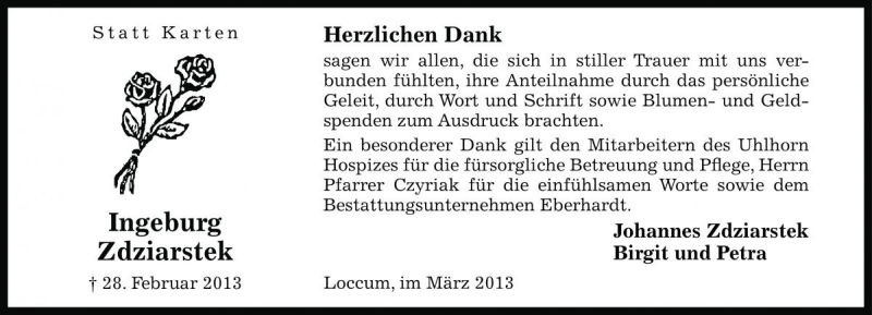 Hier finden Sie alle Traueranzeigen aus der Zeitung, die bisher für Ingeburg Zdziarstek erschienen sind. Weitere Traueranzeigen, die in der Zeitung erscheinen, werden hier ebenfalls aufgelistet