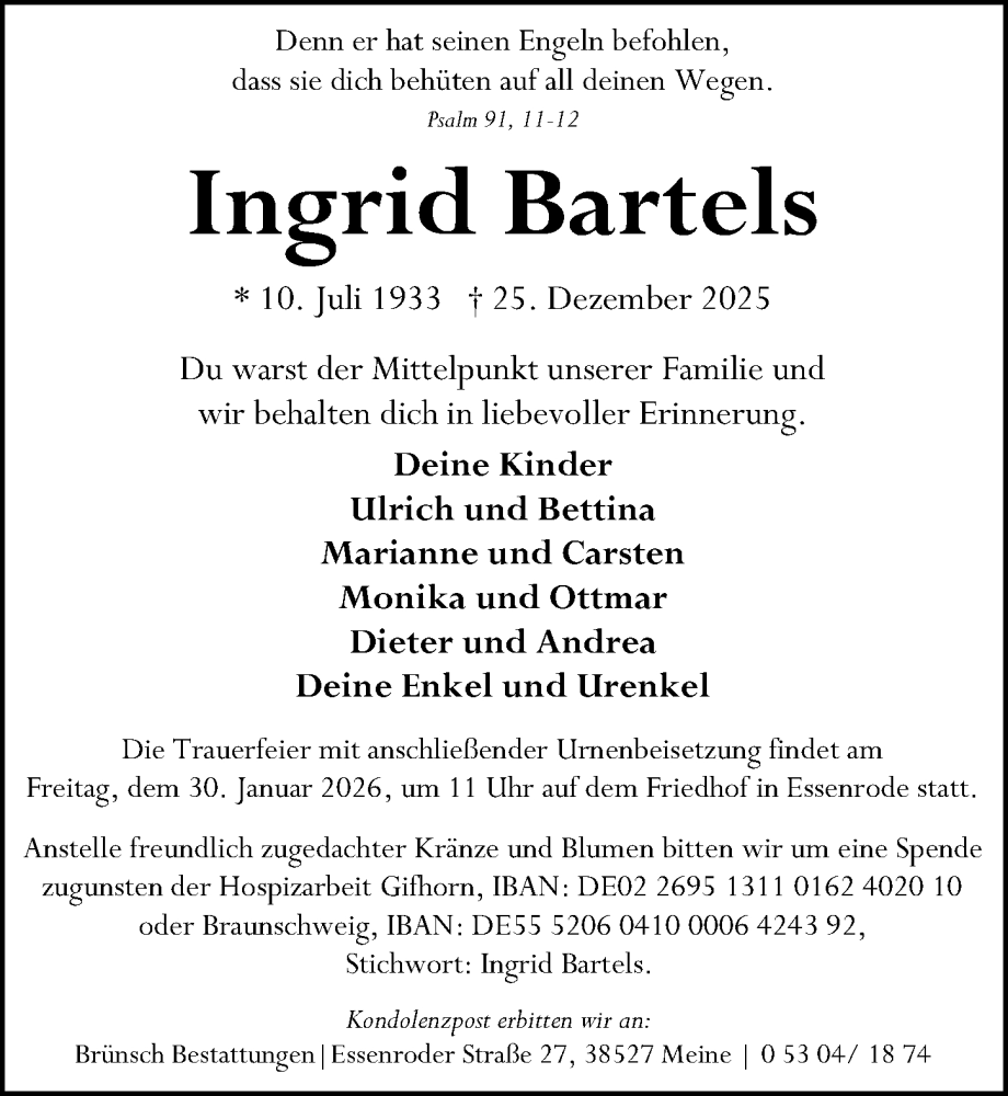 Hier finden Sie alle Traueranzeigen aus der Zeitung, die bisher für Ingrid Bartels erschienen sind. Weitere Traueranzeigen, die in der Zeitung erscheinen, werden hier ebenfalls aufgelistet