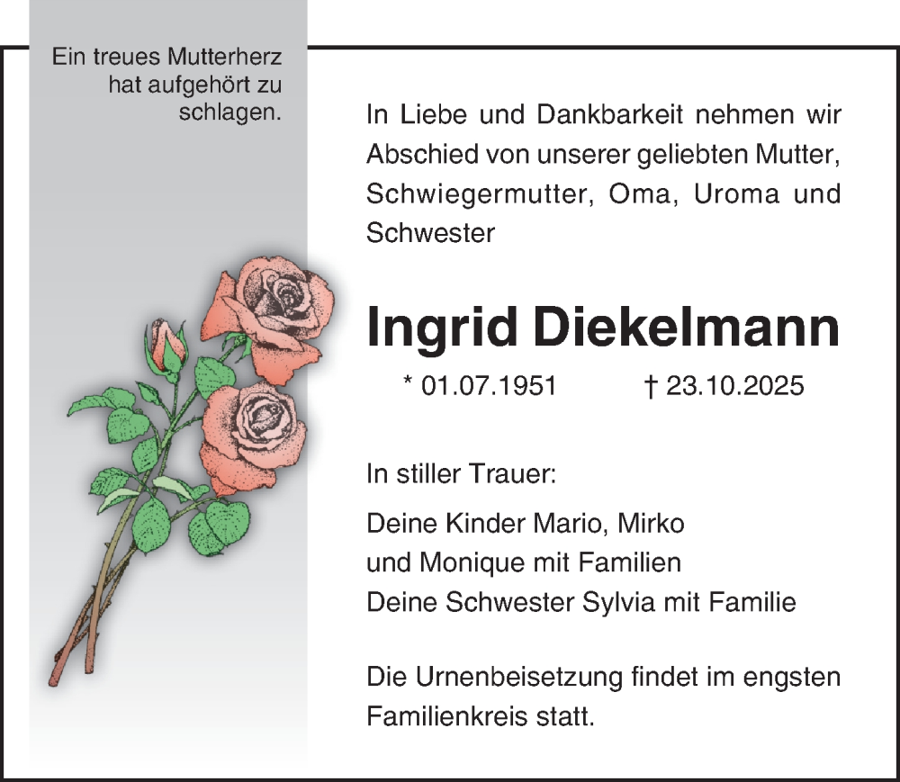 Hier finden Sie alle Traueranzeigen aus der Zeitung, die bisher für Ingrid Diekelmann erschienen sind. Weitere Traueranzeigen, die in der Zeitung erscheinen, werden hier ebenfalls aufgelistet