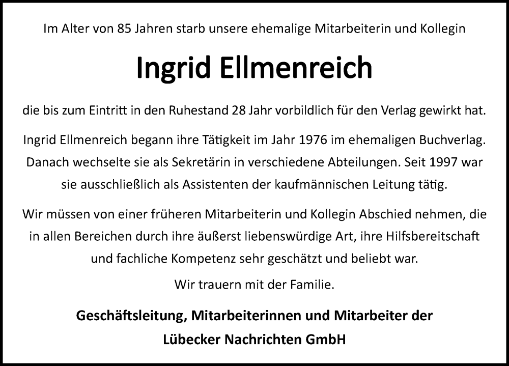 Hier finden Sie alle Traueranzeigen aus der Zeitung, die bisher für Ingrid Ellmenreich erschienen sind. Weitere Traueranzeigen, die in der Zeitung erscheinen, werden hier ebenfalls aufgelistet
